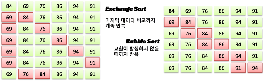 교환 정렬은 마지막 바로 이전의 데이터와 마지막 데이터를 비교할 때까지 연산을 반복하는 방법을 채택하고 있음.